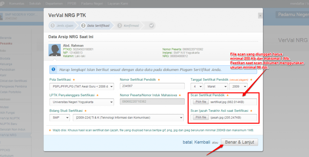 5. Selanjutnya, isikan Data Sertifikasi Anda dengan benar (Pastikan Anda telah menyiapkan file scan sertifikasi / piagam dan ijazah terakhir Anda untuk diunggah, file yang dapat diunggah adalah file dengan tipe gif, png, atau jpeg dengan minimal ukuran file 200KB dan maksimal ukuran file 1MB), Klik Benar & Lanjut untuk menyimpan data.